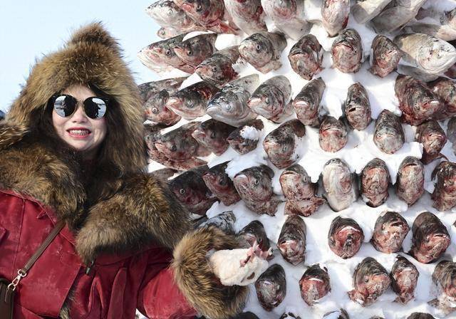 1月10日配资交易宝,在黑龙江省肇东市大似海冬捕渔猎文化节上, 游客在“冻鱼塔”前留影。新华社发(杨威摄)