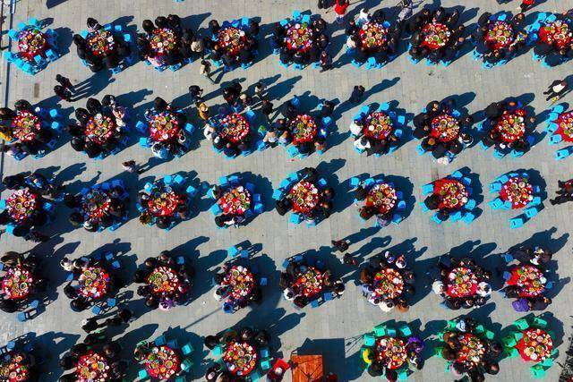 1月11日,游客在重庆市黔江区第二届武陵黑猪乡村文化节上享受武陵黑猪刨汤宴(无人机照片)。新华社发(杨敏摄)
