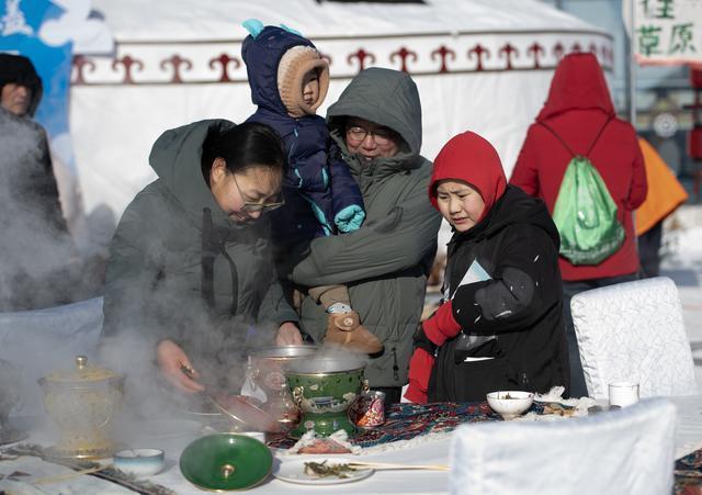 1月10日,游客在内蒙古乌拉盖第三届冰雪文旅主题活动上体验百米长桌宴。新华社发(吴潇莹摄)