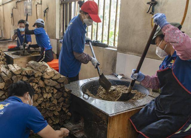 1月11日,海南省琼海市嘉积镇温泉村一家作坊工作人员在翻炒山柚籽粉。新华社发(蒙钟德摄)
