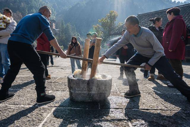 1月10日,在湖北省宣恩县沙道沟镇两河口村彭家寨,村民为游客打糍粑。新华社发(文林摄)