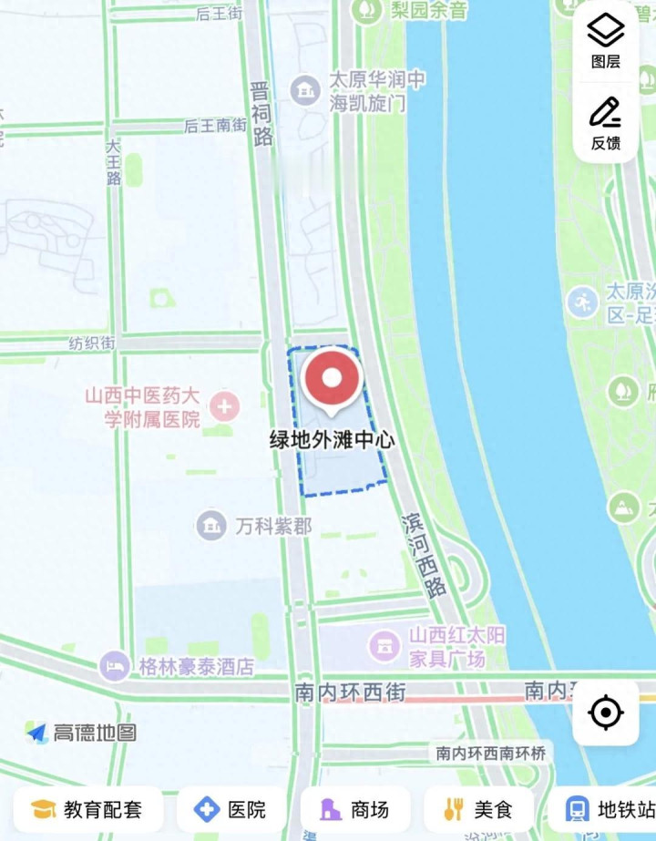 该项目就是绿地开发的绿地中央广场,也就绿地外滩中心。位于万柏林区,紧邻汾河,南有长风商务区,北靠迎泽政务区。按照当初规划,绿地中央广场项目由4栋楼组成,1-3层为连体的商业裙楼,规划有五星级酒店、公寓、写字楼、商业组成。