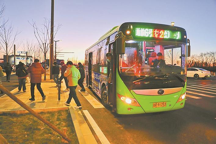1月5日,公交车抵达终点站北京地铁潞阳站,乘客有序下车,实现与地铁6号线的无缝换乘。潘宇杰摄