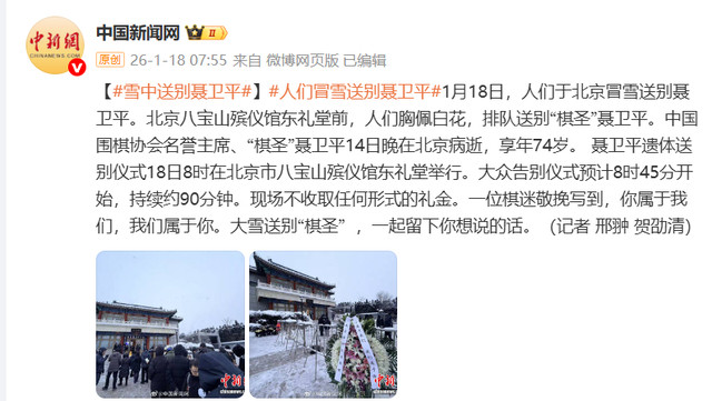 1月18日,人们于北京冒雪送别聂卫平。北京八宝山殡仪馆东礼堂前,人们胸佩白花,排队送别“棋圣”聂卫平。中国围棋协会名誉主席、“棋圣”聂卫平14日晚在北京病逝,享年74岁。聂卫平遗体送别仪式18日8时在北京市八宝山殡仪馆东礼堂举行。大众告别仪式预计8时45分开始,持续约90分钟。现场不收取任何形式的礼金。一位棋迷敬挽写到,你属于我们,我们属于你。大雪送别“棋圣”百盛证券,一起留下你想说的话。(记者邢翀贺劭清)