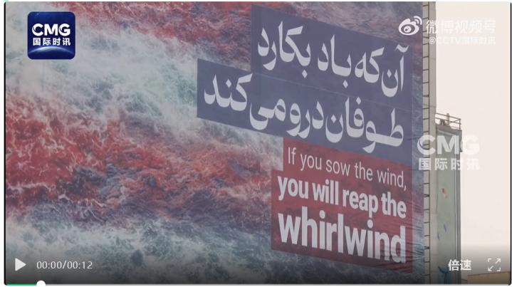这幅画中描绘了“美军航空母舰甲板上数架受损战机”,并配有波斯语和英语标语:“种下风者,必收获风暴。”(注:意为恶有恶报)