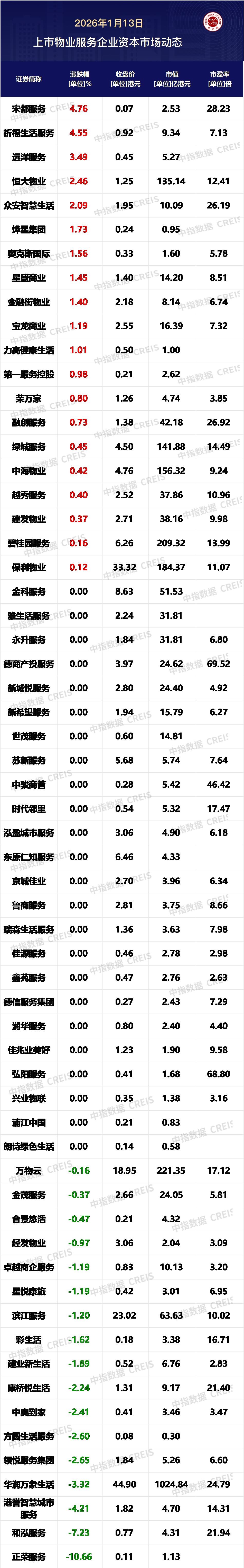 1月13日粤友钱,恒生指数,收盘上涨239.99点,涨幅约为0.90%,报收26848.47点。今日61家港股上市物业服务企业中20家上涨。宋都服务涨幅为4.76%,位列今日港股物业服务板块第一位。